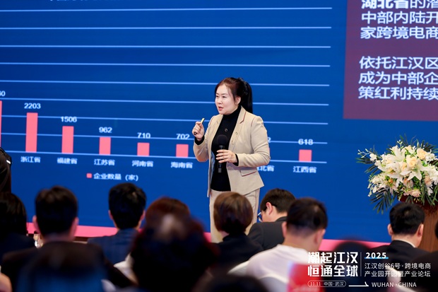 作为园区运营专家,拥有近20年国际贸易与跨境电商行业经验的郑玉鸿女士率先登台,以《数字贸易新时代:跨境电商生态的构建与共赢》为主题,结合自身参与编撰《一带一路电子商务研究》、编写多本跨境电商高校教材的专业积淀,从“政策红利、资源整合、生态闭环”三大维度深度解析行业趋势与园区核心竞争力。她提出“产业集群化+生态协同化”发展模式,强调园区“以数字化链路打通全球市场,助力‘湖北造’“江汉品”走向世界”的核心使命,引发全场掌声不断。
