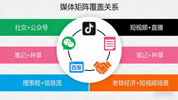 多渠道布局:全面覆盖微信、抖音、小红书、百度、快手等主流媒体平台,并根据行业特性(如教育、大健康、零售、本地生活)制定平台组合策略。