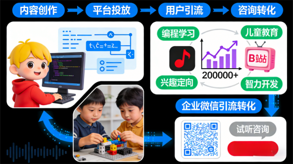 策略:打造“编程思维启蒙”系列情景短剧,在抖音、B站进行精准兴趣定向投放,引流至企业微信进行课程咨询与试听预约。