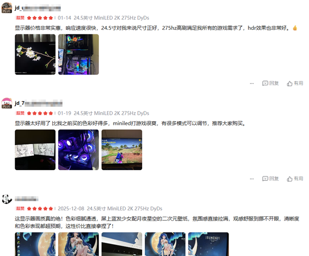 在用户评价方面,京东、天猫等核心电商平台的用户好评率均保持在95%以上。大量用户反馈:泰坦军团MiniLED显示器画质出色,控光精准,没有明显光晕;高刷搭配DyDs技术,游戏体验拉满,拖影几乎看不见;色彩还原精准,无论是打游戏还是修图都很合适;性价比超高,中端价格就能体验到高端MiniLED技术。这些真实的用户评价印证了泰坦军团MiniLED显示器的产品价值,也进一步提升了品牌的市场认可度。