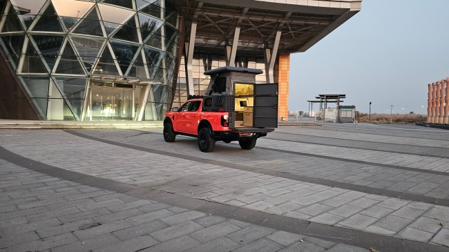 后舱旅居配置更是实现 “豪华与实用双在线”:电动折叠升降车顶搭配三层耐候带侧窗帐篷,无需手动繁琐操作,轻松拓展露营空间;折叠床板及床垫、卡座休息区与可伸缩桌板,形成灵活多变的休憩场景,空间利用率远超竞品的固定布局;更配备电磁炉、净手池、50升车载冰箱与便携工兵铲,搭配净水箱、灰水箱与 220V电源插座,真正实现 “拎包露营”,让荒野生活也能拥有城市般的便利与精致。