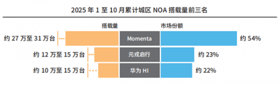 2025 年,元戎启行城区 NOA 业务单月增长倍数达 2.7 倍,位居行业第一;10 月单月搭载量超3万台,市占率约为38%,与头部玩家并列领先;2025年1-10 月累计交付 约12万至15万台,累计市占率约为23%。